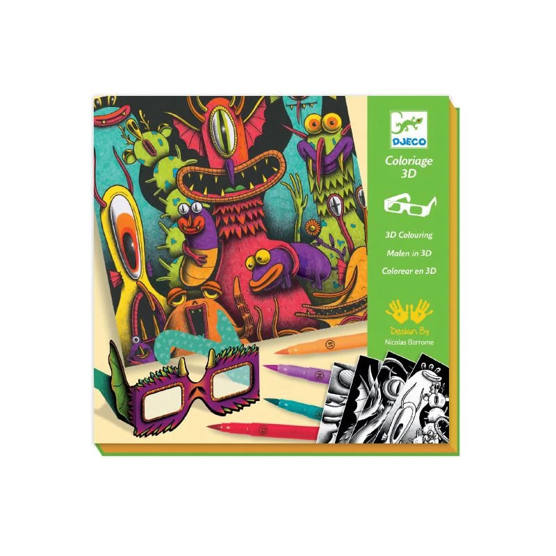Djeco propose aux enfants de 7 ans et plus de colorier avec des feutres pinceaux de drĂ´les de monstres aussi effrayants que rigolos et ensuite de les admirer Ă l’aide des lunettes 3D fournies et ainsi les voir en relief.